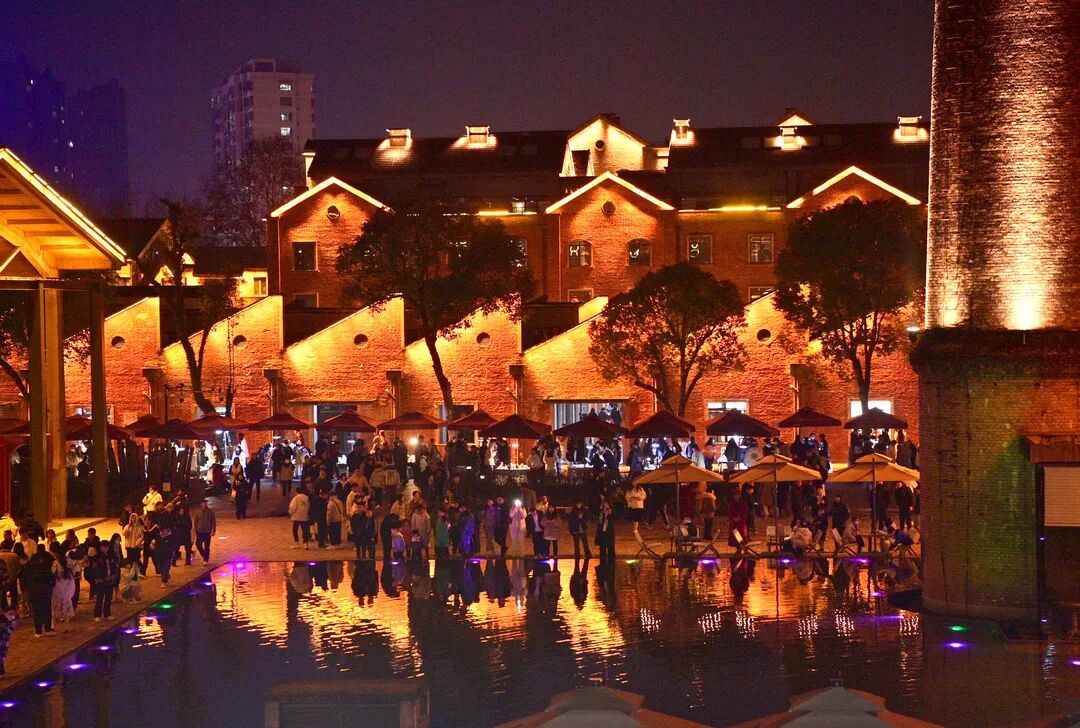 当夜幕降临,我走入陶溪川文创街区。这里由曾经的宇宙瓷厂改造而成,高大的烟囱与锯齿形厂房被保留下来,内部却注入了最现代的设计与活力。灯光将红砖墙照得温暖而梦幻,街区里人头攒动,仿佛一场盛大的派对。