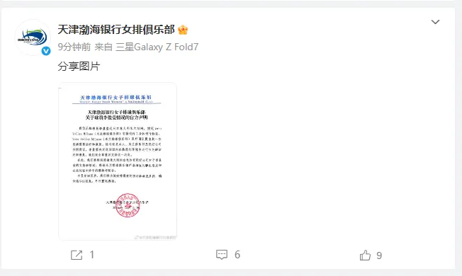 12月21日,天津渤海银行女排俱乐部发布官方声明: