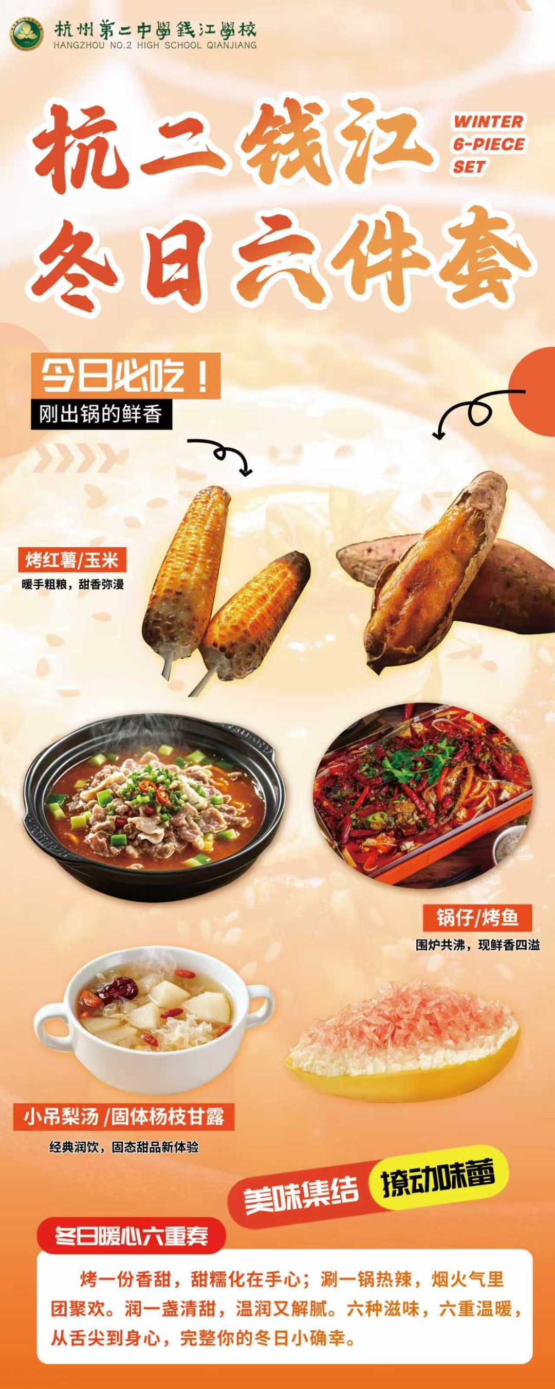 杭州第二中学钱江学校早在一个月前上新了“冬日六件套”,包括烤红薯、烤玉米、锅仔、烤鱼、小吊梨汤,还有前段时间爆火网络的固体杨枝甘露。