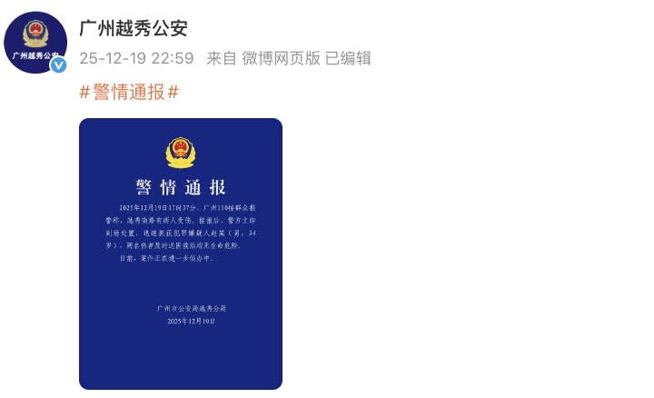 今天(12月19日)22时59分,@广州越秀公安 发布警情通报: