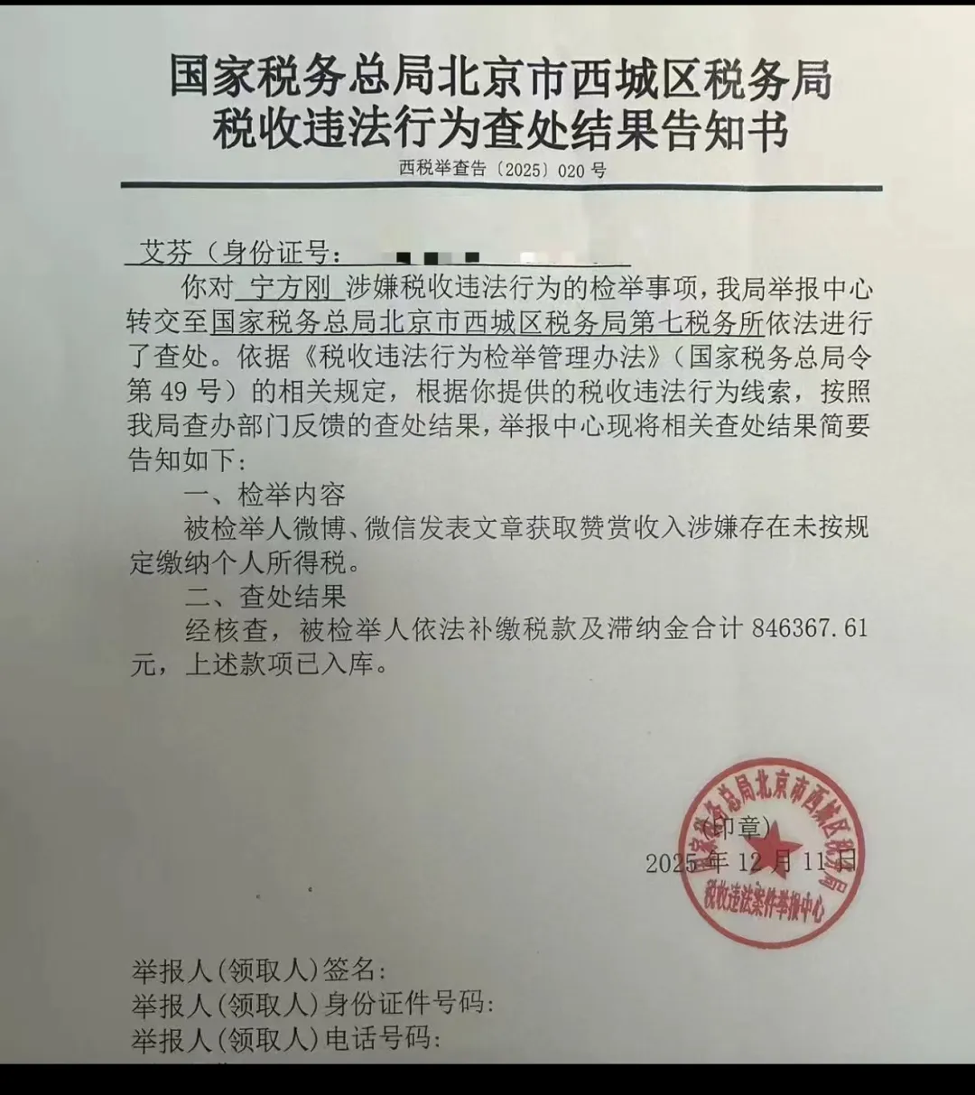 12月19日,微博用户“急诊向日葵艾芬20”(艾芬)晒出国家税务总局北京市西城区税务局税收违法行为查处结果告知书,告知书显示,艾芬举报的网红医生宁方刚(网名“烧伤超人阿宝”)因自媒体赞赏收入未按规定缴税,已补缴税款及滞纳金合计846367.61元。
