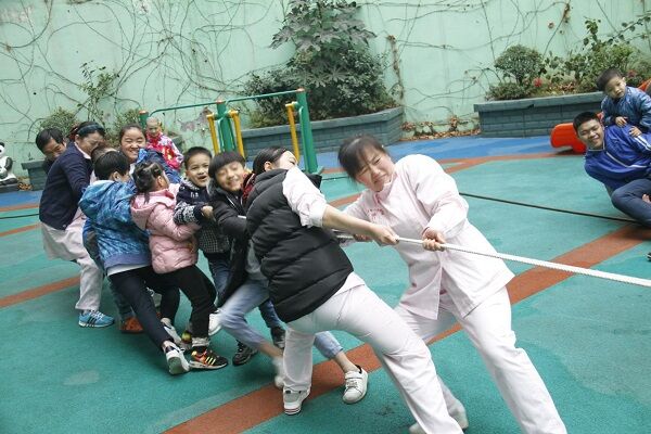 巴中市儿童福利院举办的“趣味竞技”运动会上,师生一起参加拔河比赛。刘强 摄