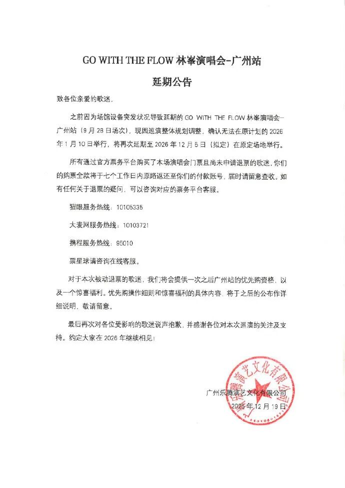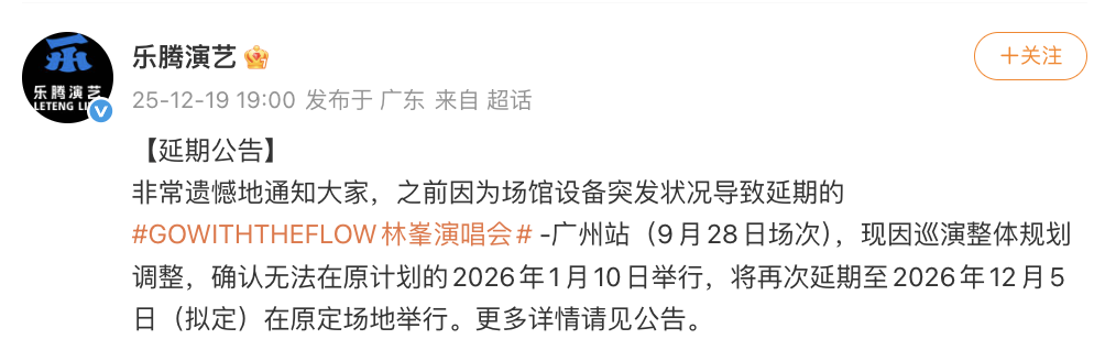 非常遗憾地通知大家,之前因为场馆设备突发状况导致延期的GOWITHTHEFLOW林峯演唱会-广州站(9月28日场次),现因巡演整体规划调整,确认无法在原计划的2026年1月10日举行,将再次延期至2026年12月5日(拟定)在原定场地举行。