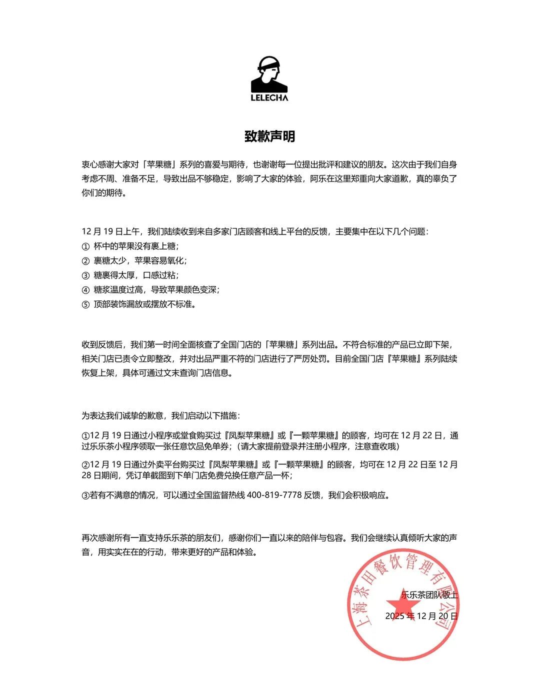 20日,知名奶茶品牌乐乐茶官方发布致歉声明表示,第一时间全面核查了全国门店的“苹果糖”系列产品,不符合标准的已立即下架,相关门店已责令立即整改,并对出品严重不符的门店进行严厉处罚。