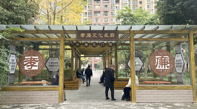 “这条孝廉文化长廊是‘联包帮’单位出资打造的,平时有活动也会在此举行,这里是最受群众欢迎的主阵地之一,也是社区干部与居民拉家常、摆龙门阵的阵地之一。”牟智烨告诉记者,每年重阳节,社区都会组织群众通过自荐、自评、自选的方式开展“最美家庭”“孝顺儿媳”“最美志愿者”“廉洁之星”等评选活动,并将评选出的“微典型”,图文并茂地集中展示在此处,“大家既能在此处晒晒太阳、休闲娱乐,也能感受孝廉文化浸润,实现以文塑廉。”