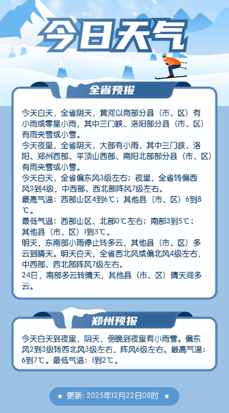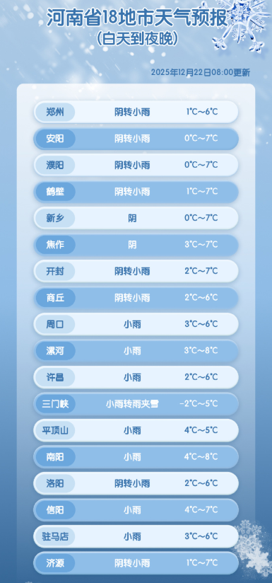 刚度过1961年以来历史同期第二暖的大雪节气,河南在今日(12月22日)迎来了气温的低点。受冷空气和暖湿气流共同影响,全省大部分地区最高气温将不足5℃,体感从前期的偏暖转为寒冷。