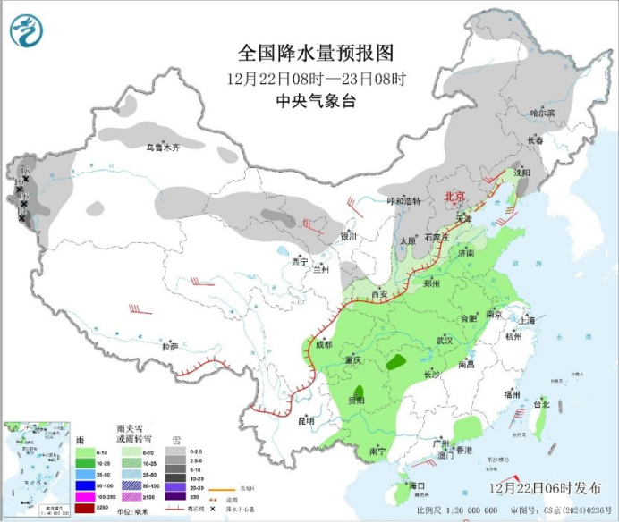 中央气象台预计,12月22日8时—23日8时,新疆西南部和沿天山地区、内蒙古西南部和中东部、东北地区、甘肃河西、青海北部、陕西中部、华北等地部分地区有小到中雪或雨夹雪,其中,南疆西部山区局地大到暴雪(10~18毫米)。陕西南部、黄淮、江淮、江汉、湖南中北部、西南地区东部、广西中西部、广东东南部、海南岛东部、台湾岛东部等地部分地区有小雨,其中,湖南西北部、贵州中部局地有中雨。