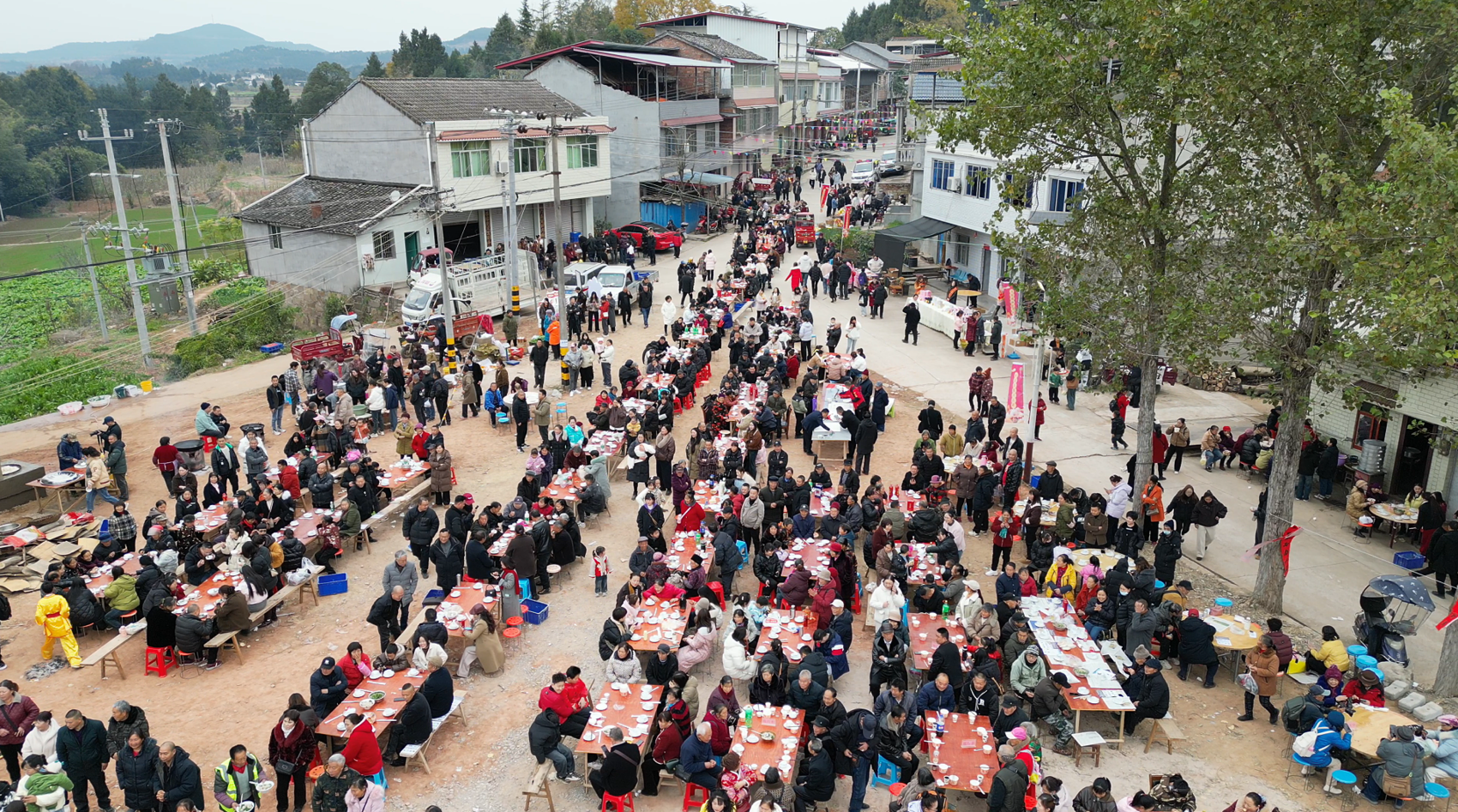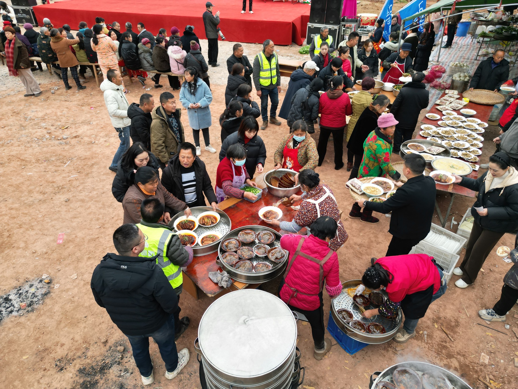 活动的“重头戏”是“杀年猪”。熟练的年猪处理展示及猪肉分享分发环节,中午时分,由庖汤宴、蒸笼宴等特色菜肴组成的长桌宴开席,大锅灶旁,凉拌猪肝、烧猪血、回锅肉、镶碗、扣肉、龙眼肉……一道道美味的佳肴被端上饭桌,大家七八个人围成一桌,大快朵颐,谈年景、话家常,浓浓的乡土人情在推杯换盏间愈发醇厚。