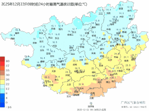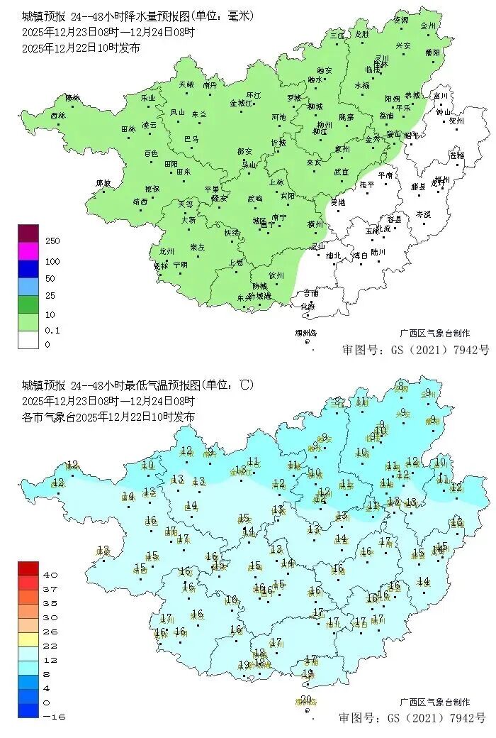 24日晚上到25日白天,全区大部阴天到多云有小雨,其中桂东北高寒山区局地有冰冻或道路结冰。