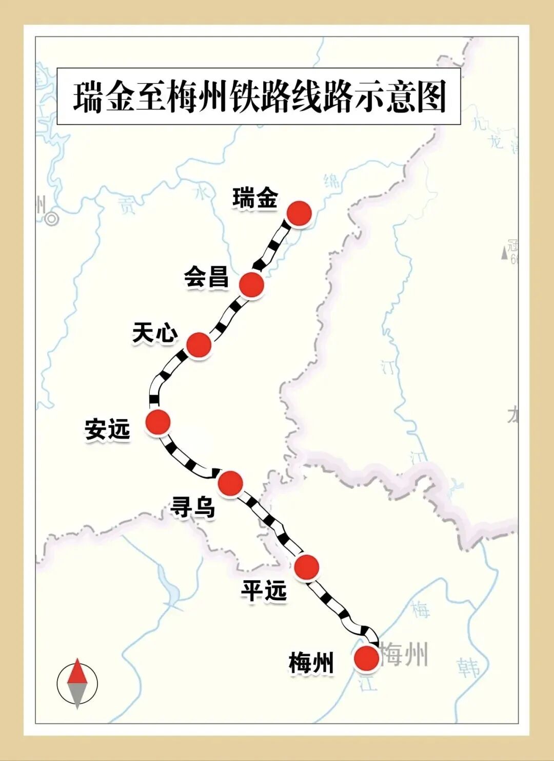瑞梅铁路北起“红色故都”江西省瑞金市,向南经会昌县、安远县、寻乌县进入广东省,最终接入梅州站,正线全长240公里,设计时速160公里。其中,江西段正线全长165公里,共设瑞金、会昌、天心、安远、寻乌5座车站,其中,瑞金站为既有接轨站,天心站为新建货运站,会昌、安远、寻乌站为新建客运站。