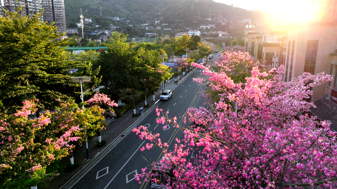 被誉为 “美人树” 的异木棉,是仁和区冬日最动人的信使。粉白花瓣层层叠叠,如云朵坠枝、似雪染芳丛,阳光穿透枝叶洒下斑驳光影,花瓣在微风中轻轻摇曳,簌簌落下的花雨,铺成一条浪漫的粉色小径。