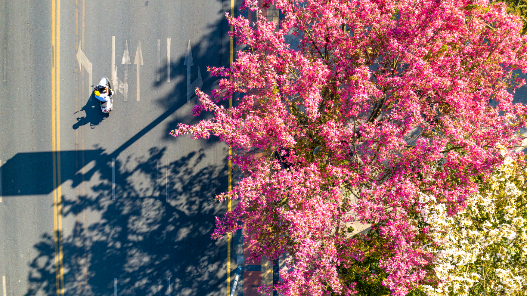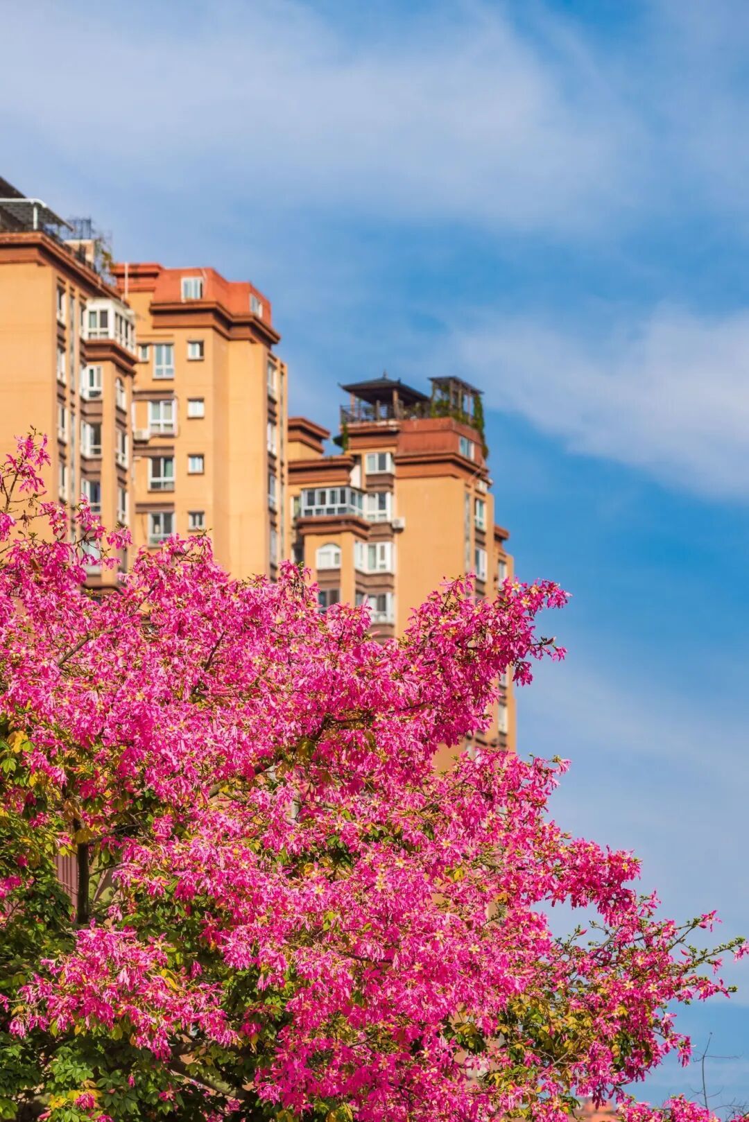 密密匝匝的花簇撑开如伞,与澄澈如洗的蓝天相映,随手定格便是自带柔光的胶片感大片。若想沉浸式感受这份美好,不妨搭乘粉色 “萌萌巴” 环线公交,车窗外粉浪翻涌,城市在花影中流动,每一段路程都成了与浪漫的不期而遇。