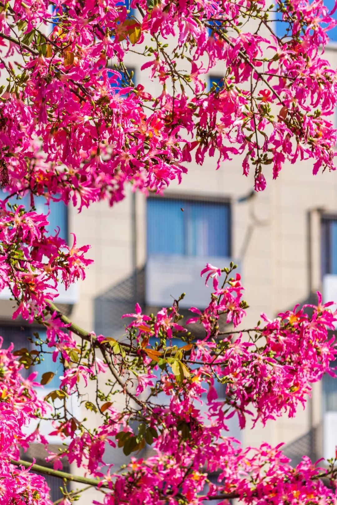 这份粉色浪漫从深秋蔓延至次年新春,11至12月的盛花期,更是将美好推向极致。滨河河道旁,花影倒映在清冽的水波中,随涟漪轻轻晃动,静谧中透着诗意。异木棉 “珍惜眼前人” 的花语,恰似这暖冬里的温柔絮语,让无数游客慕名而来,赴一场与粉色冬日的约定。