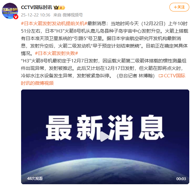 据央视新闻,当地时间今天(12月22日)上午10时51分左右,日本“H3”火箭8号机从鹿儿岛县种子岛宇宙中心发射升空。火箭上搭载有日本准天顶卫星系统的“引路5”号卫星。据日本宇宙航空研究开发机构最新消息,发射升空后,火箭二级发动机“早于预定计划结束燃烧”。目前正在确定其具体情况。