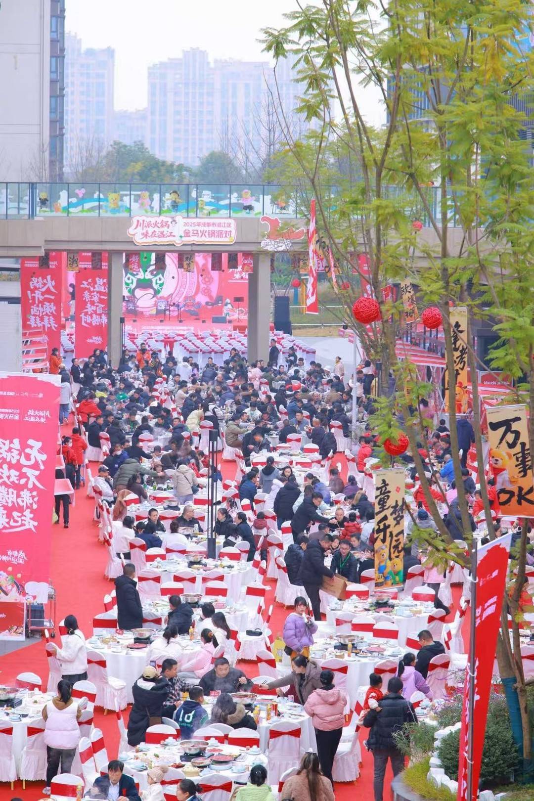 中午的火锅盛宴则是一幅“金马壹家人”的团圆图景,邻居变桌友,朋友成“涮友”。川剧变脸演员穿行在桌间,一转身、一挥手引来满堂彩;“小丑”送出造型气球,逗得孩子们开怀大笑;乐队歌声响起,不少居民跟着轻轻哼唱。抽奖环节更是高潮迭起,“围炉煮茶”体验名额、泰迪熊盲盒、正版玩偶等好礼,一波波送到幸运儿手中。