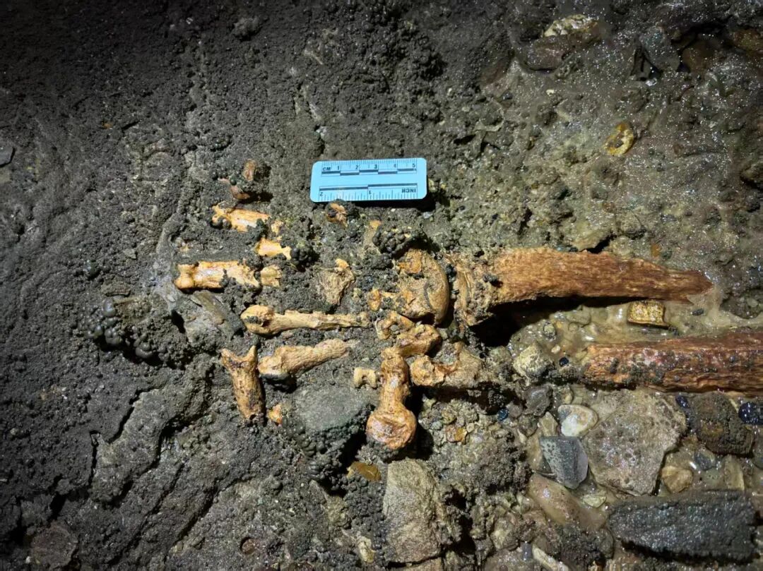 图为研究人员在双河洞洞穴内部查看发现的熊猫化石遗骸。(受访者供图)