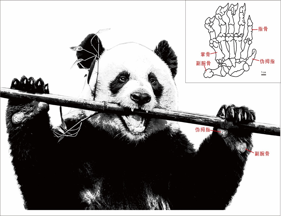 与其他熊类相比,大熊猫多出一个“拇指”,其常利用这个“拇指”与其他五个“手指”合作抓取竹子,但其并非真正意义上的拇指,因此被称为“伪拇指”。
