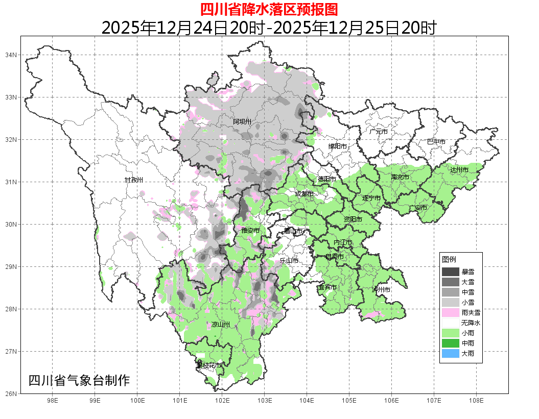 其中24日晚上到25日白天,阿坝州大部、甘孜州东部南部和攀西地区大部阴天间多云有阵雪或阵雨,局地中到大雪,需注意防范雨雪天气带来的不利影响。
