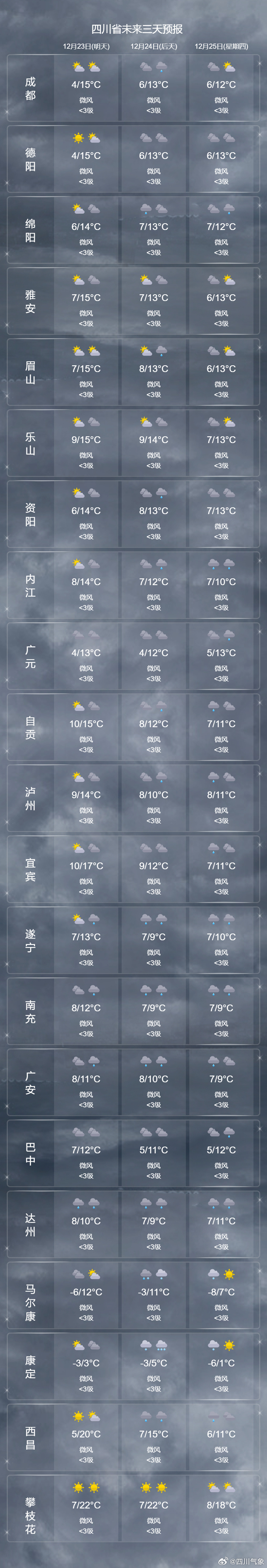 四川省气象台预计,今天(12月22日)晚上到25日白天,盆地以阴天或阴天间多云天气为主,部分地方有小雨或零星小雨,高海拔山区有雨夹雪或小雪,北部中部23日有3~5级偏北风,局地6级或以上。