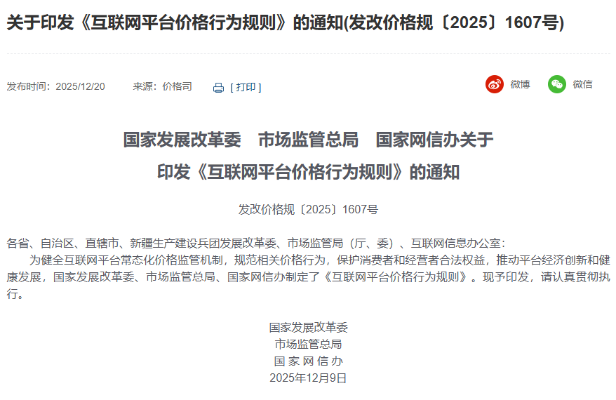 近日,国家发展改革委、市场监管总局、国家网信办联合发布《互联网平台价格行为规则》(以下简称《行为规则》)。