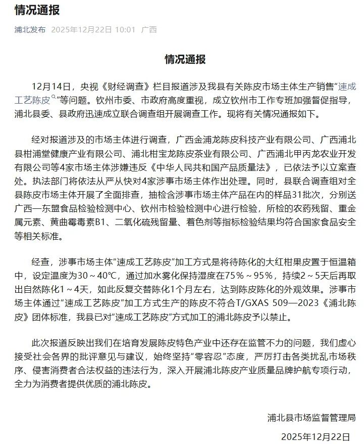 12月14日,央视《财经调查》栏目报道涉及我县有关陈皮市场主体生产销售“速成工艺陈皮”等问题。钦州市委、市政府高度重视,成立钦州市工作专班加强督促指导,浦北县委、县政府迅速成立联合调查组开展调查工作。现将有关情况通报如下。经对报道涉及的市场主体进行调查,广西金浦龙陈皮科技产业有限公司、广西浦北县柑浦堂健康产业有限公司、浦北柑宝龙陈皮茶业有限公司、广西浦北甲丙龙农业开发有限公司等4家市场主体涉嫌违反《中华人民共和国产品质量法》,已依法予以立案查处。执法部门将依法从严从快对4家涉事市场主体作出处理。同时,县联合调查组对全县陈皮市场主体开展了全面排查,抽检含涉事市场主体产品在内的样品31批次,分别送广西—东盟食品检验检测中心、钦州市检验检测中心进行检验,所检的农药残留、重金属元素、黄曲霉毒素B1、二氧化硫残留量、着色剂等指标检验结果均符合国家食品安全等相关标准。经查,涉事市场主体“速成工艺陈皮”加工方式是将待陈化的大红柑果皮置于恒温箱中,设定温度为30~40℃,通过加水雾化保持湿度在75%~95%,持续2~5天后再取出自然陈化1~4天,如此反复交替陈化1个月左右,达到陈皮陈化的外观效果。涉事市场主体通过“速成工艺陈皮”加工方式生产的陈皮不符合T/GXAS 509—2023《浦北陈皮》团体标准,我县已对“速成工艺陈皮”方式加工的浦北陈皮予以禁止。此次报道反映出我们在培育发展陈皮特色产业中还存在监管不力的问题,我们虚心接受社会各界的批评意见与建议,始终坚持“零容忍”态度,严厉打击各类扰乱市场秩序、侵害消费者合法权益的违法行为,深入开展浦北陈皮产业质量品牌护航专项行动,全力为消费者提供优质的浦北陈皮。