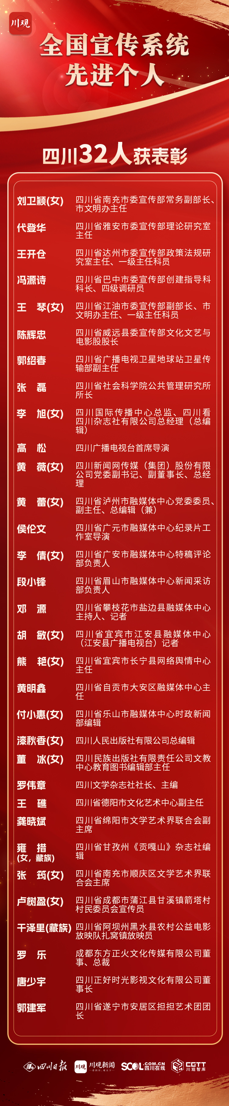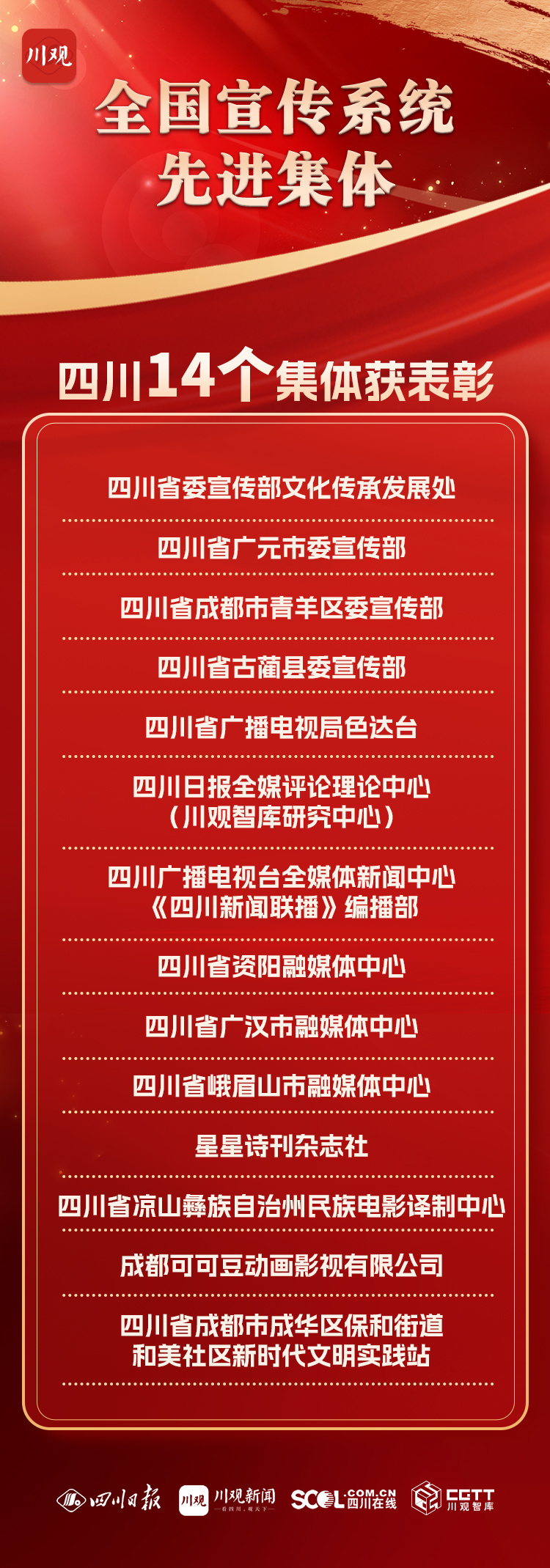 在本次表彰中,四川省荣获表彰的先进集体涵盖宣传管理、媒体融合、文化传承等多个领域,先进个人来自新闻采编、文艺创作、基层服务等岗位,他们中有深入践行媒体融合发展的记者编辑,深情讴歌时代巨变的文艺创作者,推动产业创新发展的经营管理能手,还有扎根“泥土”的基层一线宣传员等。这些先进集体与个人,坚持以习近平文化思想为指引,守正创新、担当作为,用实际行动为文化强省建设注入鲜活动能,为谱写中国式现代化四川新篇章凝聚精神力量。