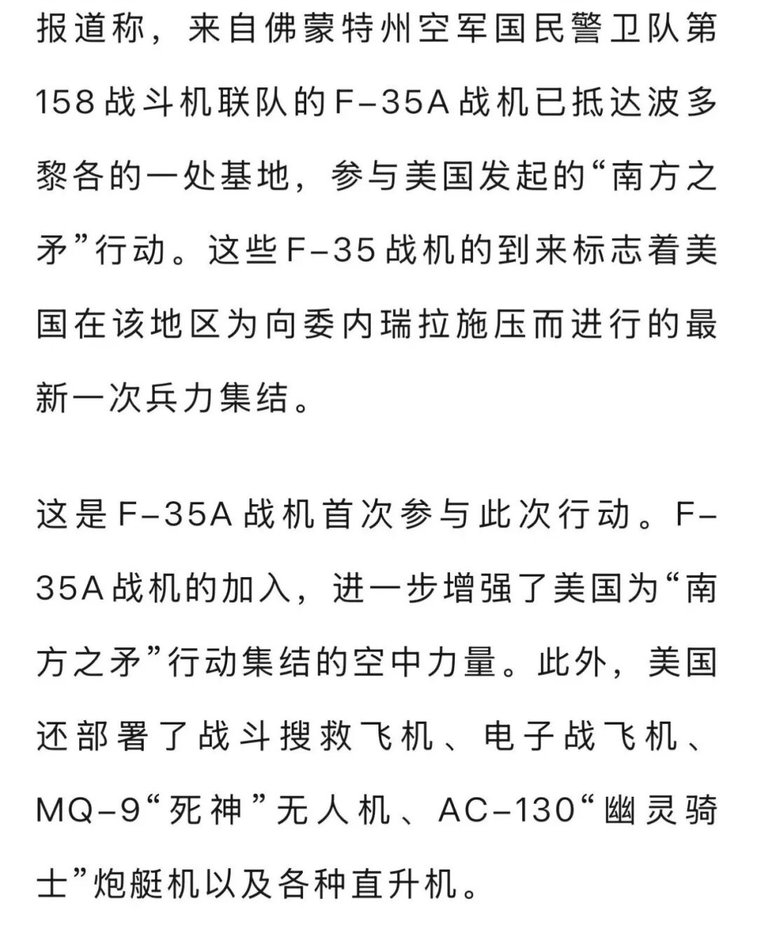 据环球时报21日报道,美国对委内瑞拉加紧施压之际,美军已向加勒比海地区派出F-35战机。