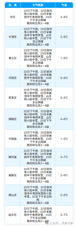 周二(23日)早上到中午有雨夹雪,山区有小到中雪,下午到夜间多云转晴,降水概率80%,北风3~4级,最低气温市区2℃左右,其他区县0~2℃,最高气温8℃左右。