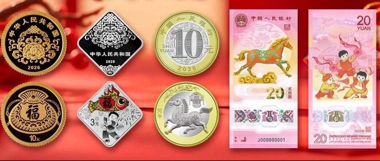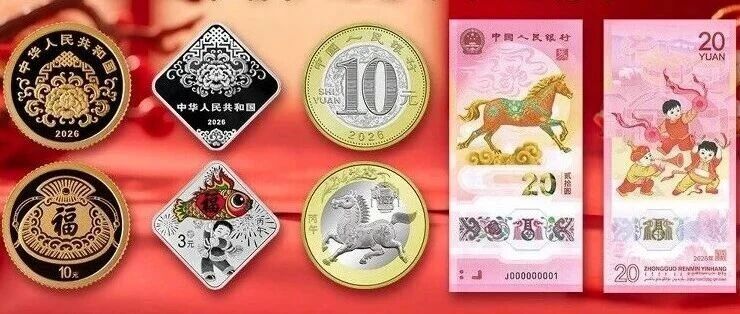 12月22日,中国人民银行发行2026年贺岁金银纪念币一套。纪念币共2枚,其中金质纪念币1枚,银质纪念币1枚,均为中华人民共和国法定货币。该套金银纪念币正面图案均为中国传统吉祥纹饰组合图案,并刊国名、年号。此套金银纪念币由深圳国宝造币有限公司铸造,中国金币集团有限公司总经销。