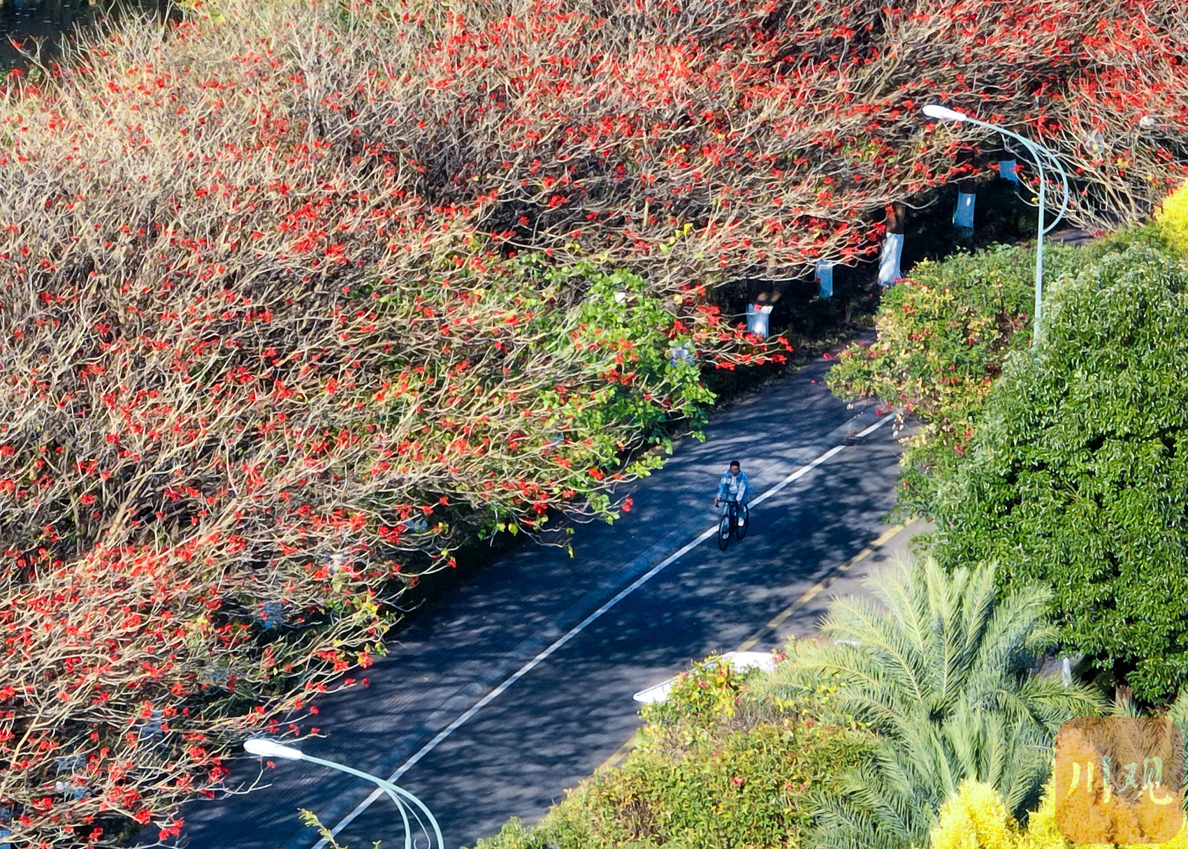 12月21日,西昌邛海湿地公园内刺桐花盛开,吸引不少市民与游客前来骑行赏景,感受冬日暖阳下的自然之美。