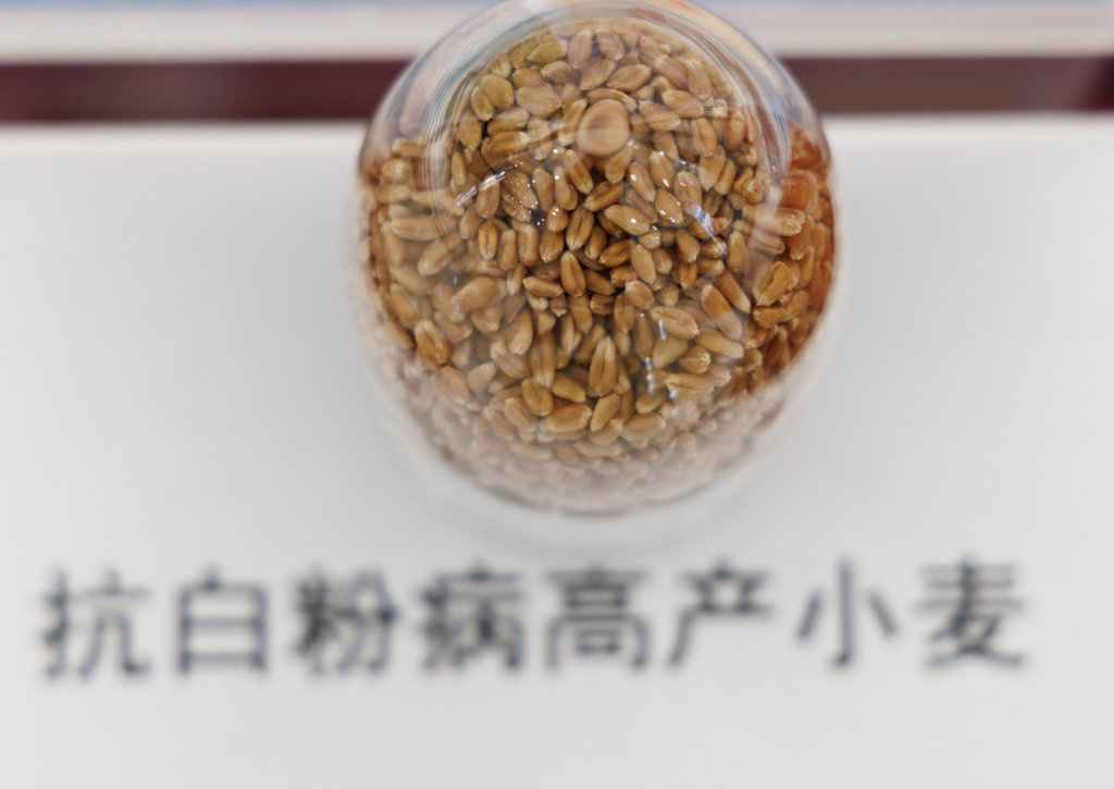 这是发布会现场展示的抗白粉病高产小麦(12月22日 摄)。