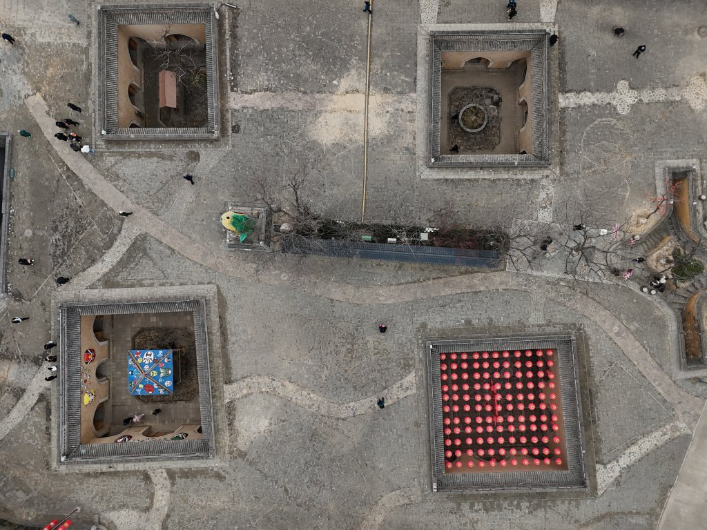 12月21日,游客在河南省三门峡市陕州区张汴乡北营村地坑院参观(无人机照片)。