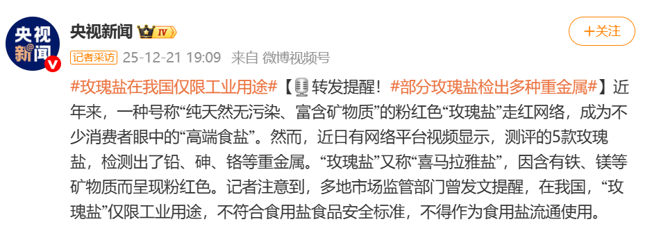 补充矿物质的效果远不及牛奶、蔬菜等天然食材。另外,‘玫瑰盐’作为天然岩盐,如果未经严格提纯,可能含铅、砷、铬等,存在潜在的重金属污染,长期摄入可能引发健康风险。