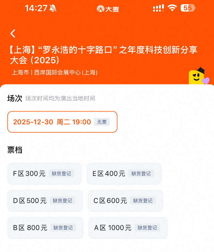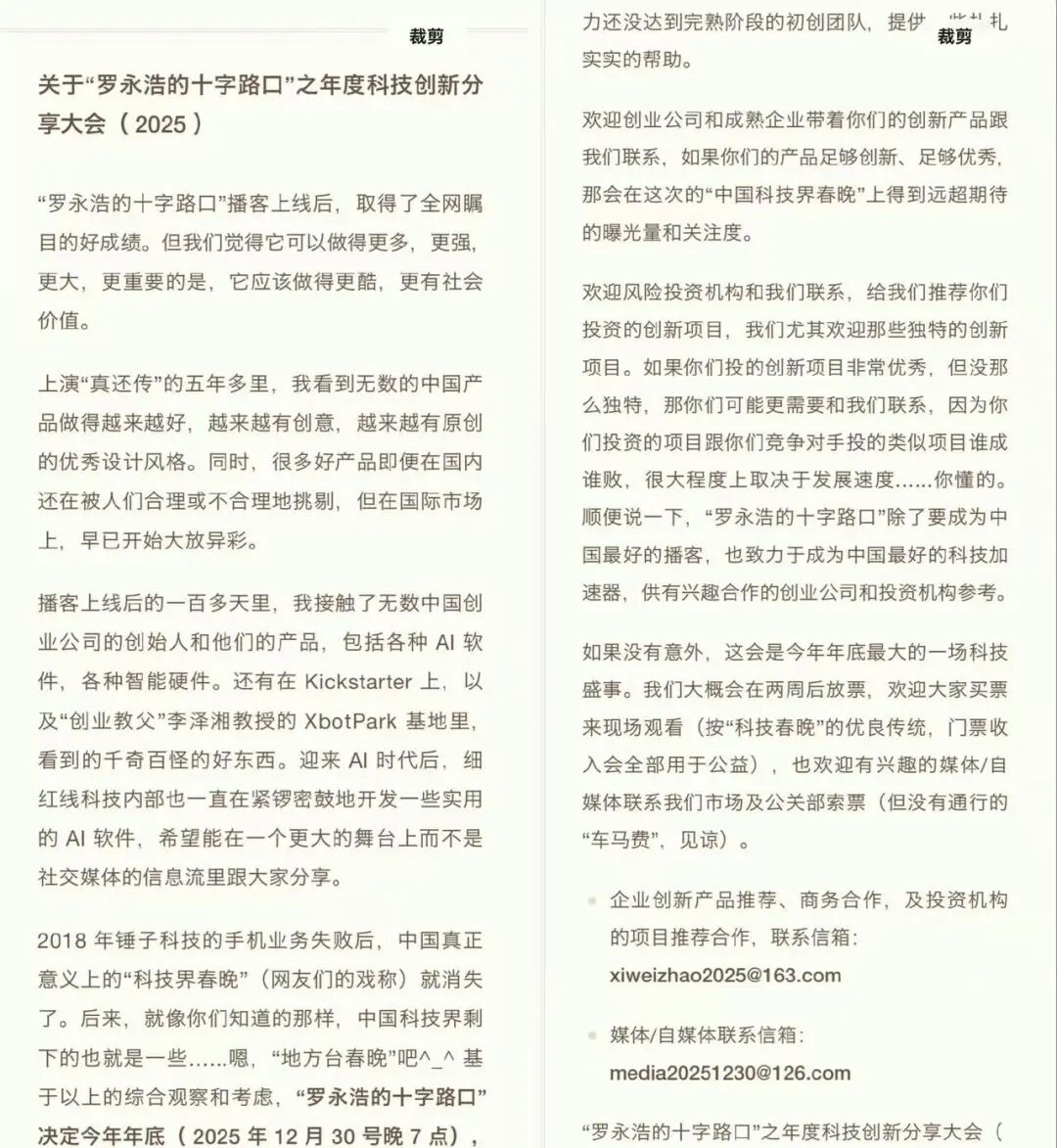 早在12月1日,罗永浩就在社交媒体预告,此次分享会将于今年12月30日19时在上海召开,按照过往“科技春晚”的传统,门票收入会全部用于公益。