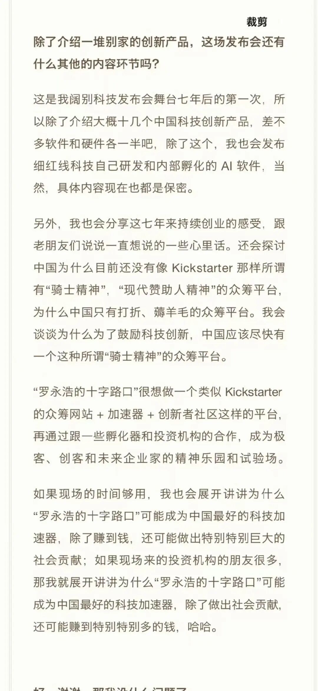 罗永浩强调,科技创新分享大会不是“带货直播”,大会上还将发布细红线科技内部开发的AI软件。
