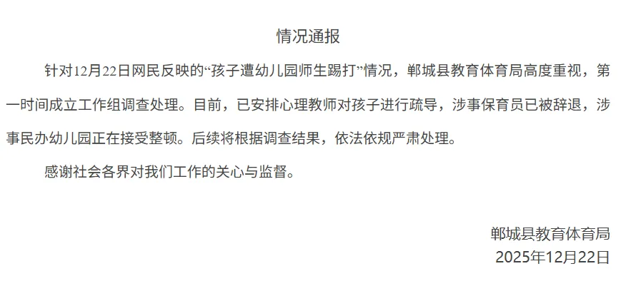 针对12月22日网民反映的“孩子遭幼儿园师生踢打”情况,郸城县教育体育局高度重视,第一时间成立工作组调查处理。