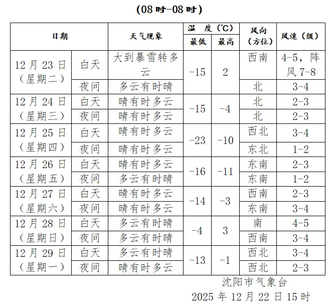 明天沈阳气温-16℃~2℃,西南风4~5级转北风3~4级、阵风7~8级。需加强防范降雪、寒潮、大风天气对交通出行、能源供应、设施农业等的不利影响。