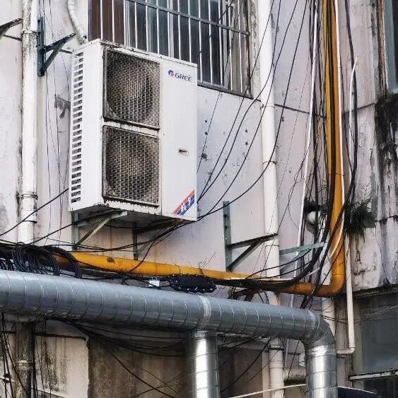 在丹阳市体育小区附近检查时,考核巡查组看到,附近居民楼有一低压架空燃气管道,与附近变压器引出的一根强电电缆并行缠绕敷设约50米。