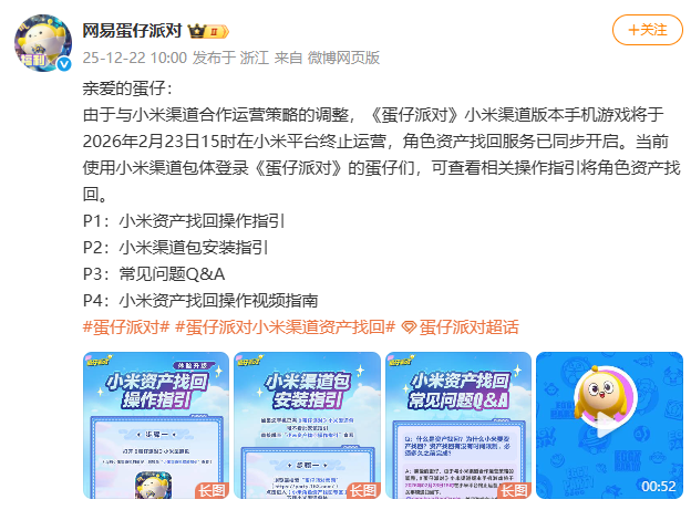 12月22日,网易手游《蛋仔派对》官方宣布,由于与小米渠道合作运营策略的调整,《蛋仔派对》小米渠道版本手机游戏将于2026年2月23日15时在小米平台终止运营,角色资产找回服务已同步开启。