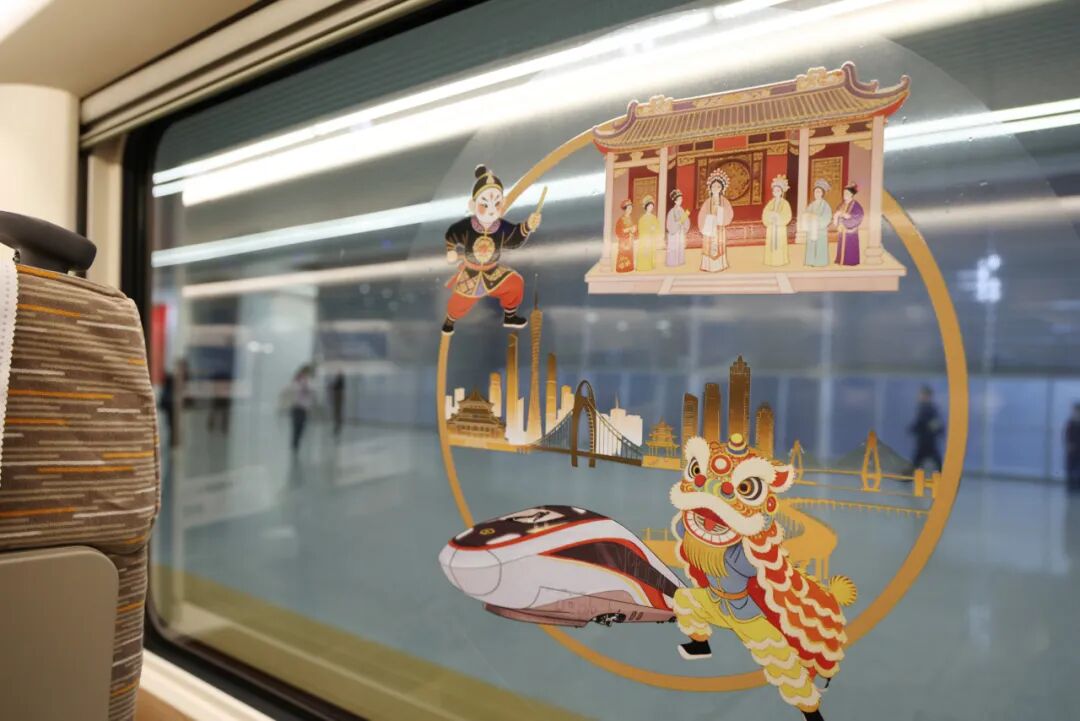 10时30分,列车缓缓启动。车厢内顿时热闹起来,车窗上张贴的岭南特色窗花与剪纸,为旅程平添了一份文化韵味。窗外,岭南田园、城镇乡村飞速掠过。