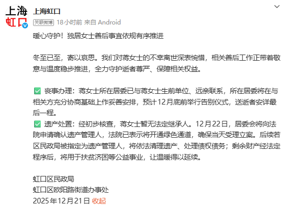 遗产处置:经初步核查,蒋女士暂无法定继承人。12月22日,居委会将向法院申请确认遗产管理人,法院已表示将开通绿色通道,确保当天受理立案。后续若区民政局被指定为遗产管理人,将依法清理遗产、处理债权债务;剩余财产经法定程序后,将用于扶贫济困等公益事业,让温暖得以延续。