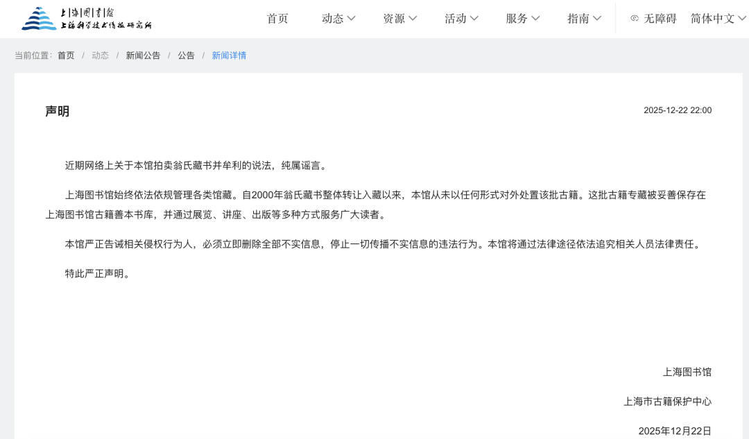 12月22日,上海图书馆官网发布一则辟谣声明,全文如下: