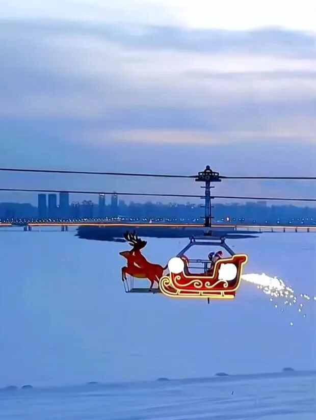当游客搭乘驯鹿主题轿厢缓缓升空,脚下是冰封雪裹、宛如银色玉带的松花江,身旁是银装素裹、尽显北国风情的城市风光。随着索道在高空缓缓穿行,惊喜也不期而至——装扮一新的童话人物乘坐“空中巡游”装置现身,与轿厢内的游客挥手互动,瞬间将人带入现实版的冬日童话,令人沉醉其中。