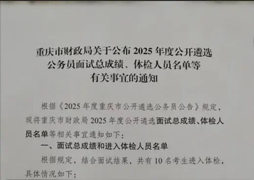 当天,重庆市财政局人事教育处出具的《关于公布2025年度公开遴选公务员面试总成绩、体检人员名单等有关事宜的通知》称,根据相关规定,结合面试结果,共有10名考生进入体检。
