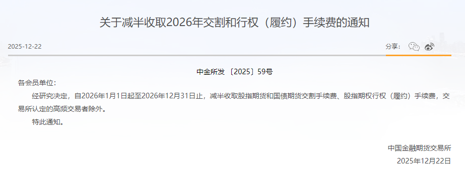 中国金融期货交易所经研究决定,自2026年1月1日起至2026年12月31日止,减半收取股指期货和国债期货交割手续费、股指期权行权(履约)手续费,交易所认定的高频交易者除外。