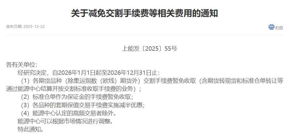 上海国际能源交易中心经研究决定,自2026年1月1日起至2026年12月31日止:(1)各期货品种(除集运指数(欧线)期货外)交割手续费暂免收取(含期货转现货和标准仓单转让等通过能源中心结算并按交割标准收取手续费的业务);(2)标准仓单作为保证金的手续费暂免收取;(3)各品种的套期保值交易手续费实施减半优惠;(4)能源中心认定的高频交易者除外。能源中心可以根据市场情况进行调整。