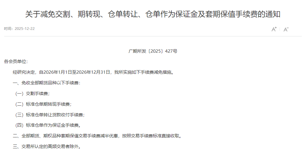 广州期货交易所经研究决定,自2026年1月1日至2026年12月31日,我所实施如下手续费减免措施。一、免收全部期货品种以下手续费:(一)交割手续费;(二)标准仓单期转现手续费;(三)标准仓单转让货款收付手续费;(四)标准仓单作为保证金手续费。二、全部期货、期权品种套期保值交易手续费减半优惠,按照交易手续费标准直接收取。三、交易所认定的高频交易者除外。