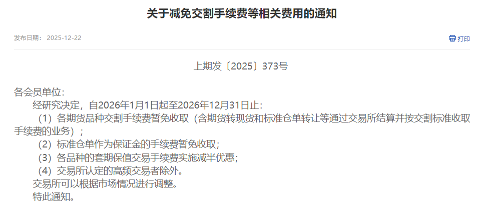 上海期货交易所经研究决定,自2026年1月1日起至2026年12月31日止:(1)各期货品种交割手续费暂免收取(含期货转现货和标准仓单转让等通过交易所结算并按交割标准收取手续费的业务);(2)标准仓单作为保证金的手续费暂免收取;(3)各品种的套期保值交易手续费实施减半优惠;(4)交易所认定的高频交易者除外。交易所可以根据市场情况进行调整。