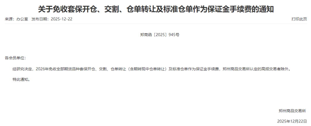 郑州商品交易所经研究决定,2026年免收全部期货品种套保开仓、交割、仓单转让(含期转现中仓单转让)及标准仓单作为保证金手续费,郑州商品交易所认定的高频交易者除外。