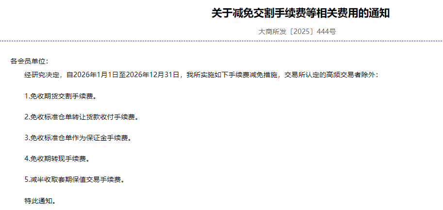 大连商品交易所经研究决定,自2026年1月1日至2026年12月31日,我所实施如下手续费减免措施,交易所认定的高频交易者除外:1.免收期货交割手续费。2.免收标准仓单转让货款收付手续费。3.免收标准仓单作为保证金手续费。4.免收期转现手续费。5.减半收取套期保值交易手续费。